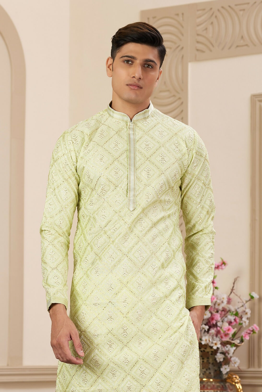 Raivat Ethnic Men's Art Silk Thread Work Kurta Pyjama In Green Colour