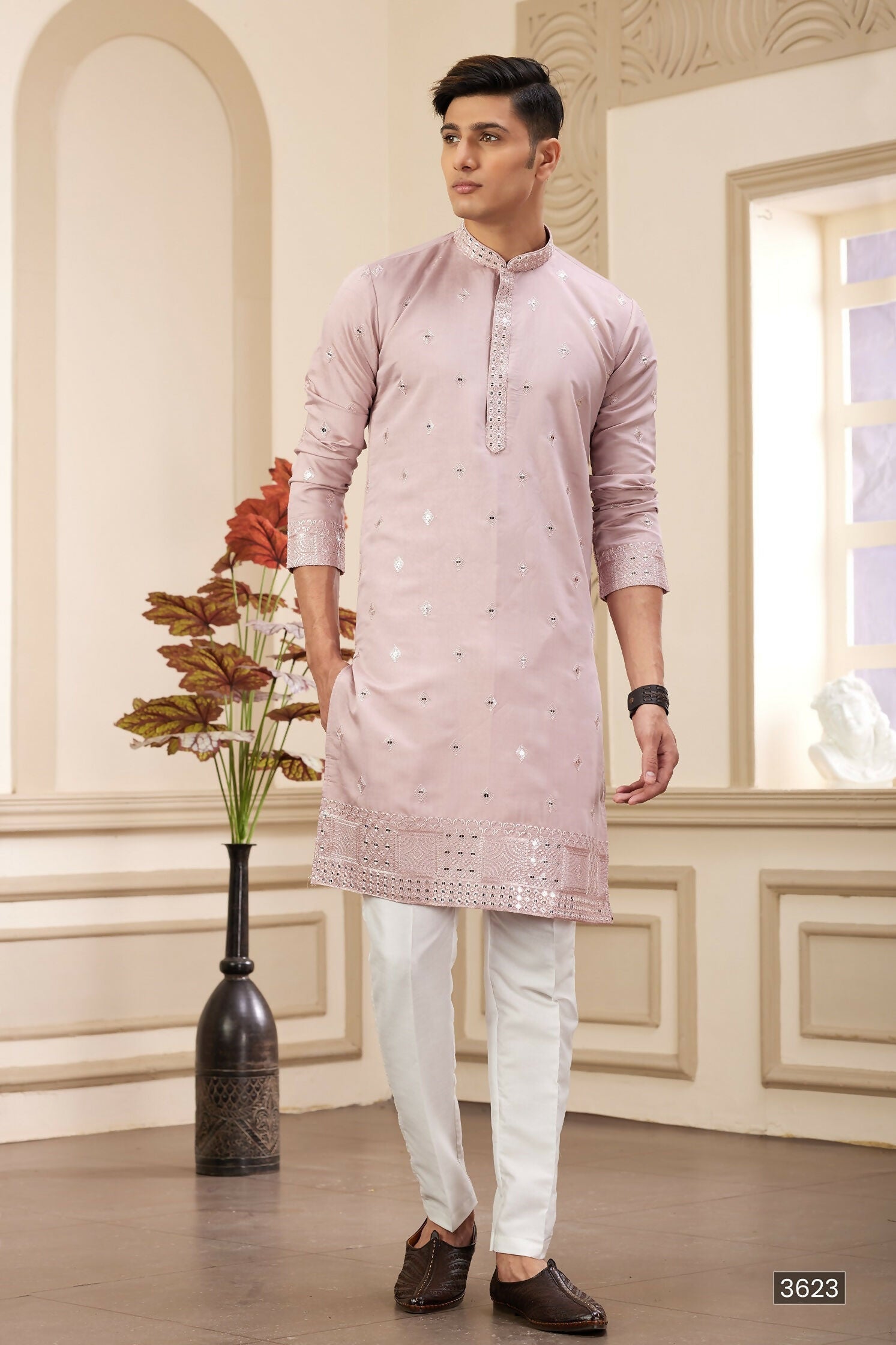 Raivat Ethnic Men's Art Silk Thread Work Kurta Pyjama In Onion Colour
