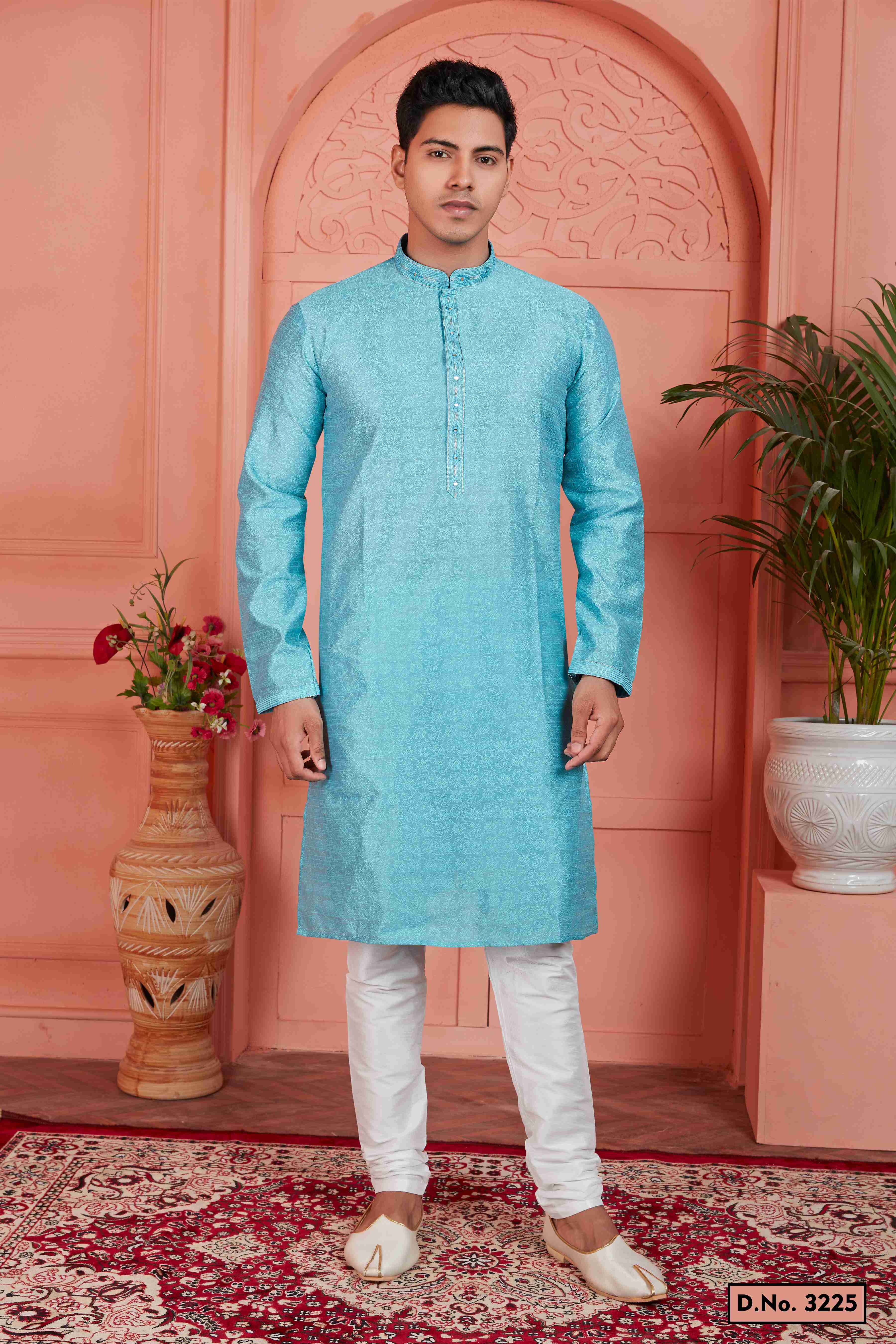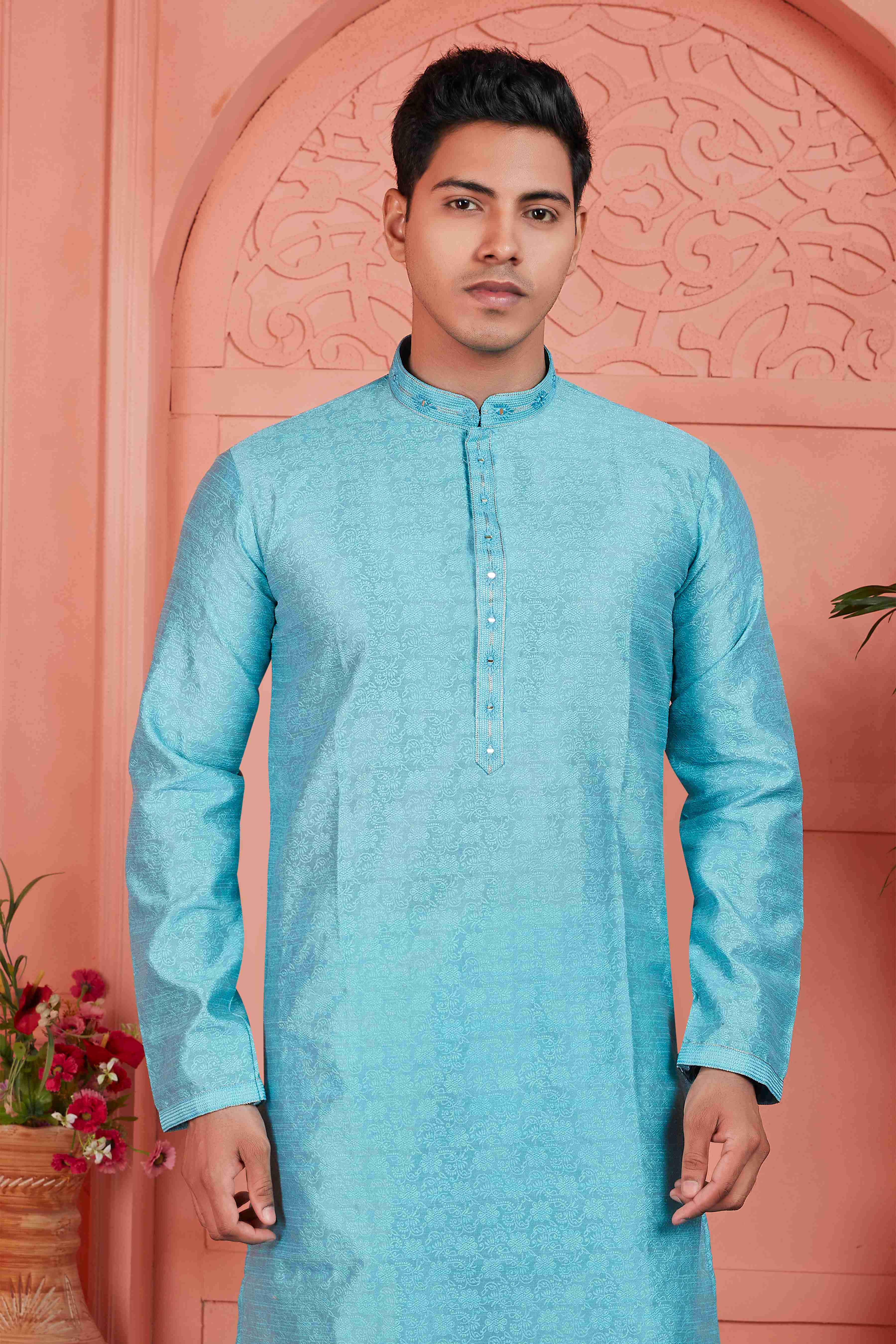 Raivat Ethnic Men's Jacquard Silk Brocade Mirror and Pintux Work Kurta Pyjama In Blue Colour