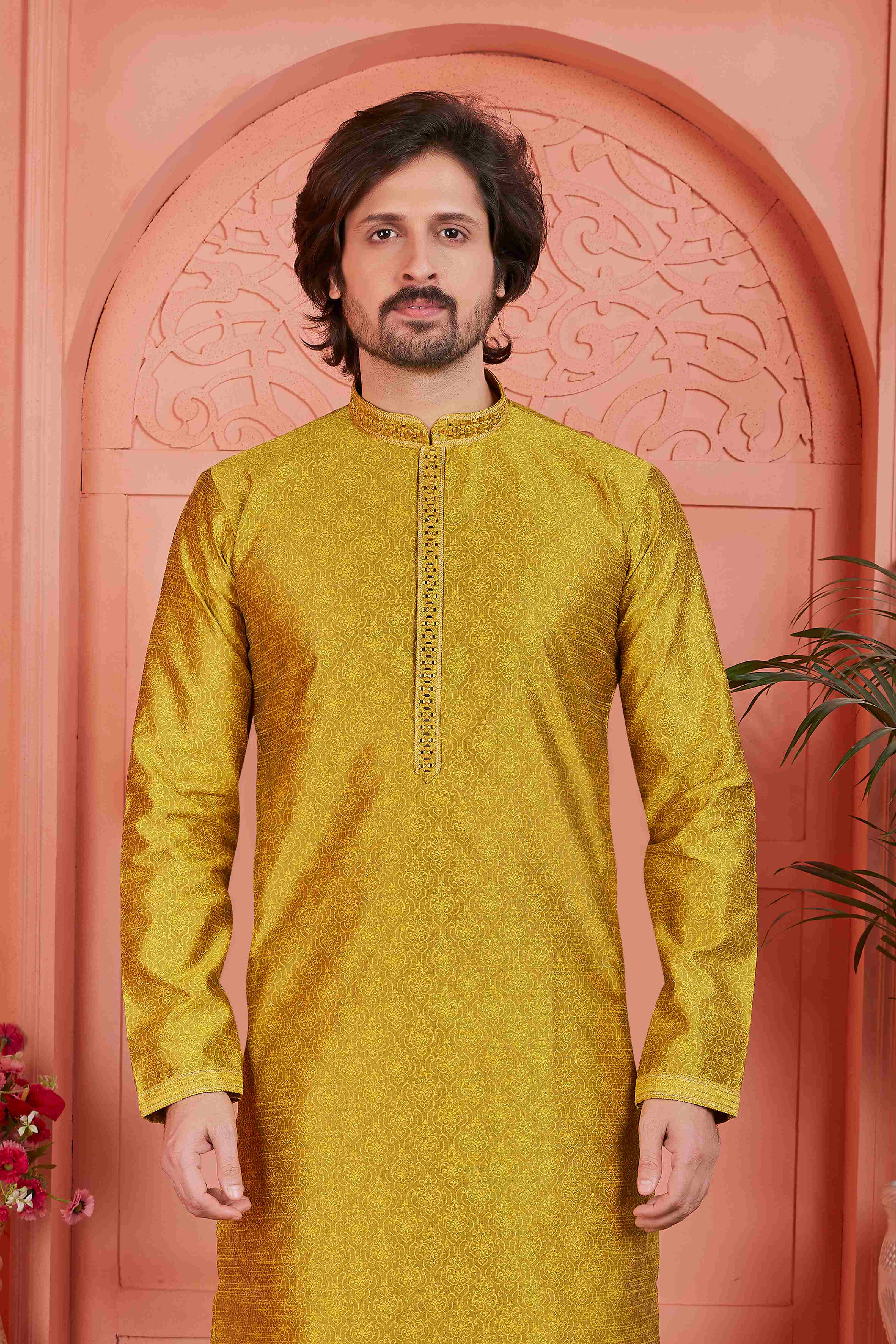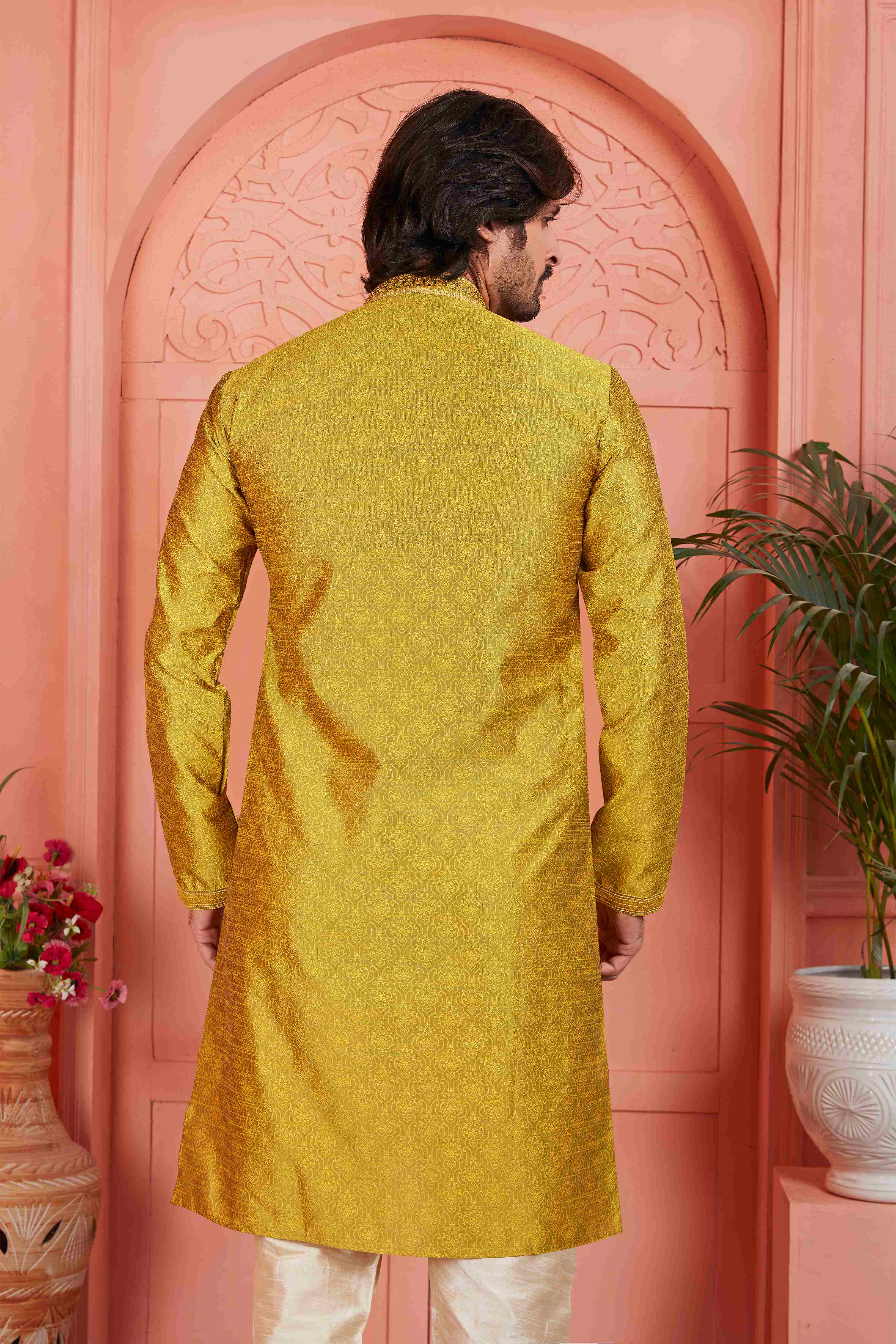 Raivat Ethnic Men's Jacquard Silk Brocade Mirror and Pintux Work Kurta Pyjama In Gold Colour