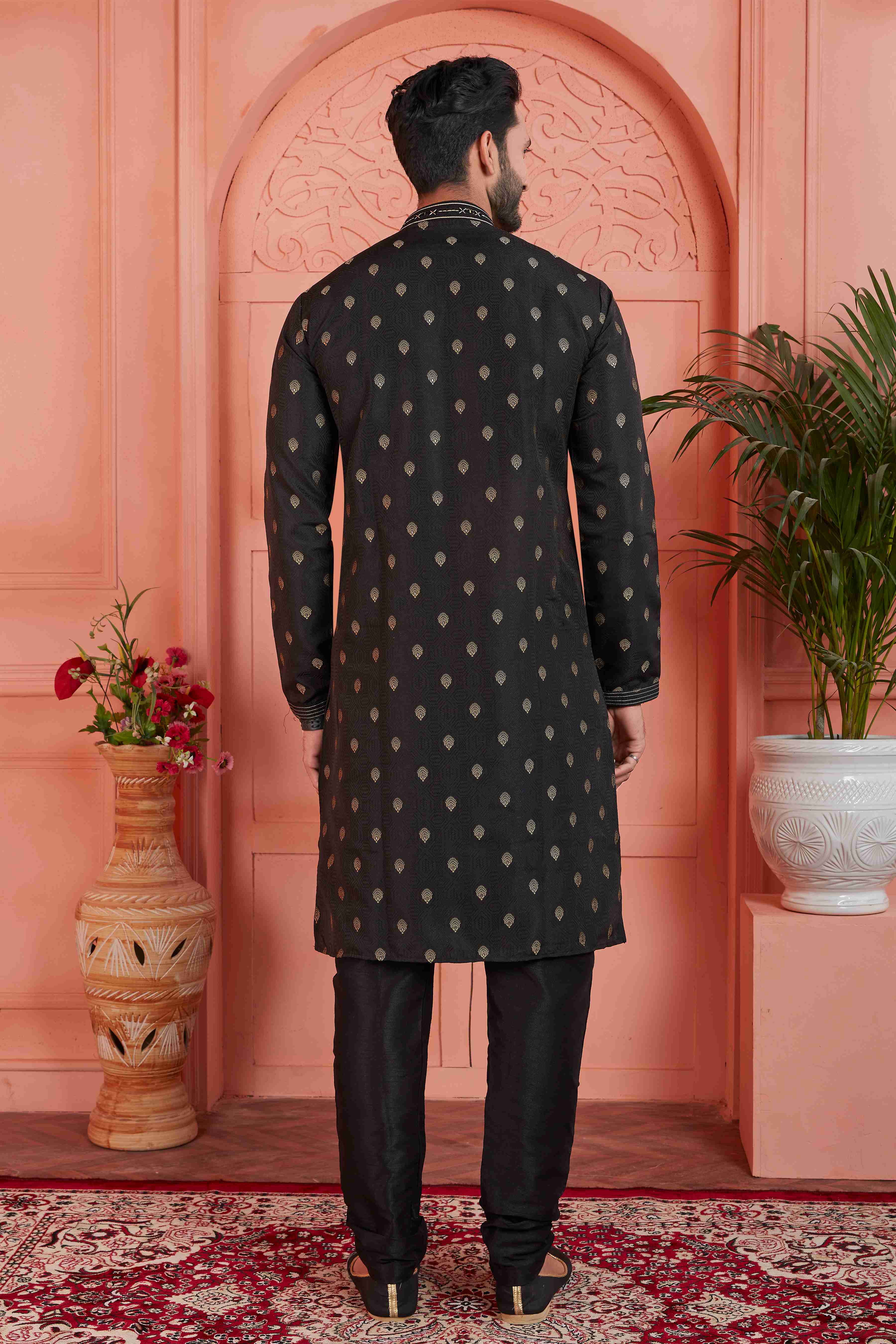 Raivat Ethnic Men's Jacquard Silk Brocade Pintux Work Kurta Pyjama In Black Colour