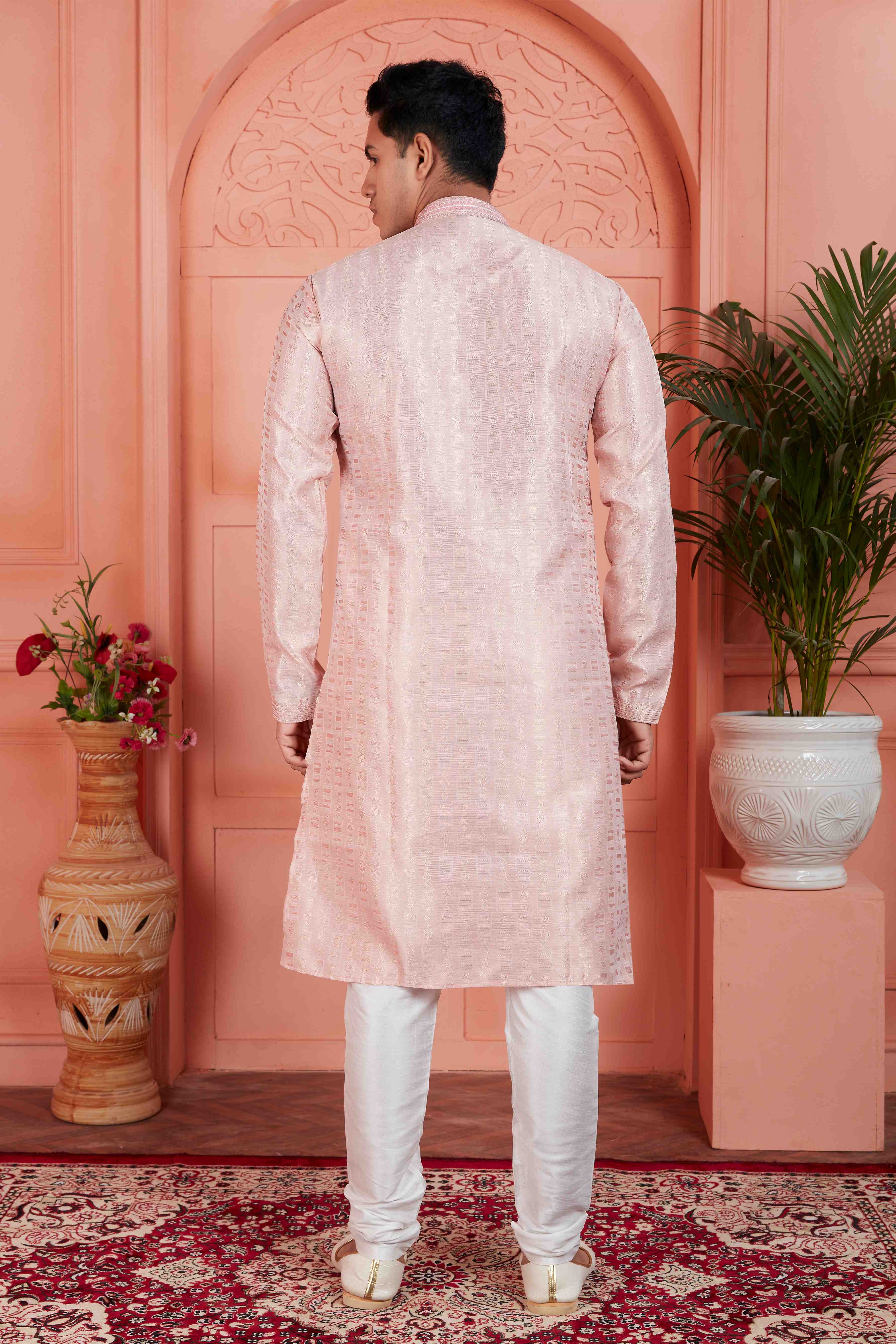 Raivat Ethnic Men's Jacquard Silk Brocade Pintux Work Kurta Pyjama In Peach Colour