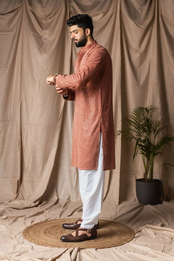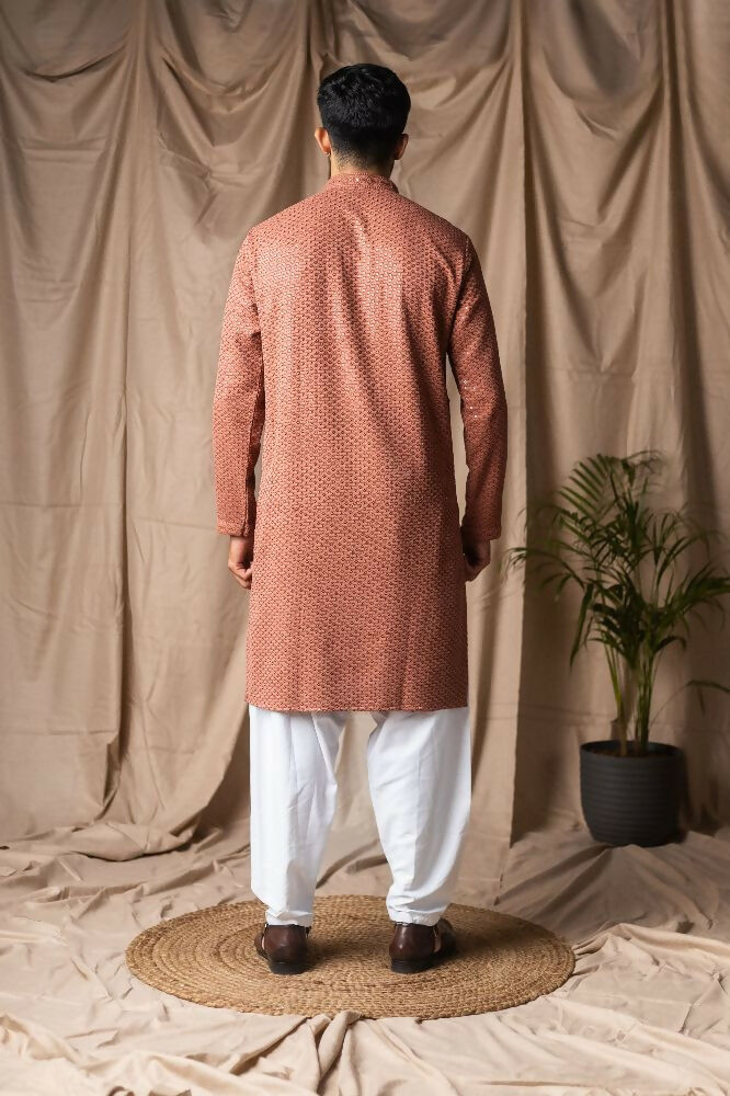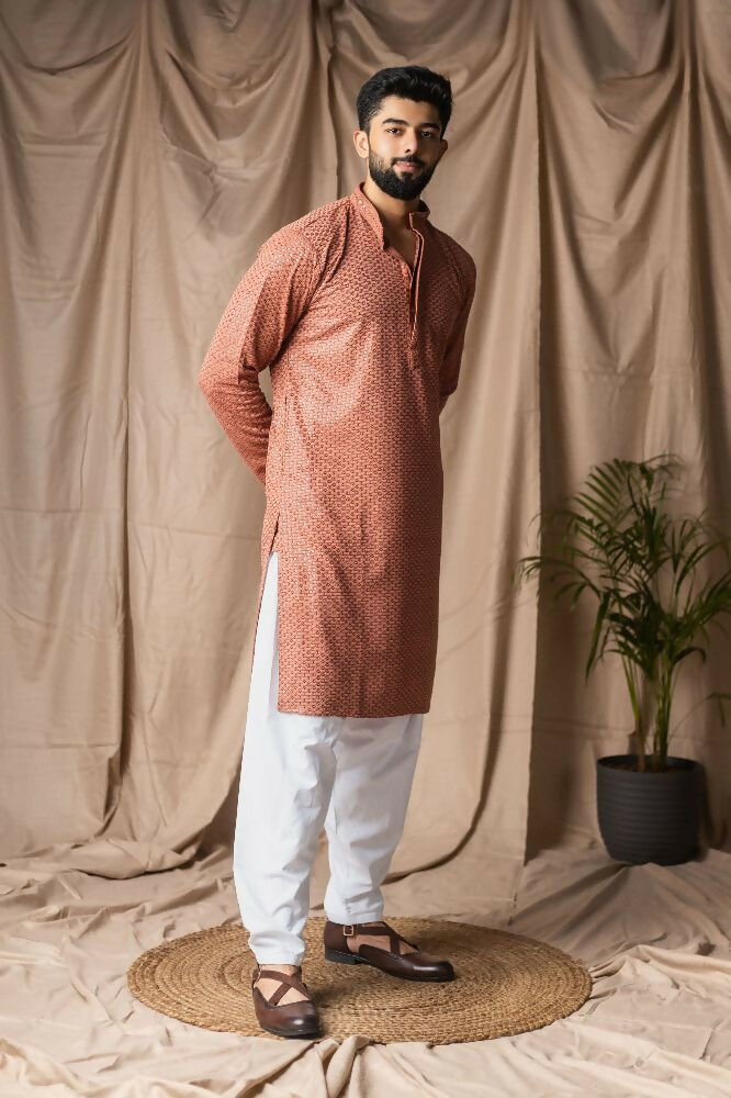 Reddish Orange Rayon Thread Embroidery Work Kurta Set - Mahotsav