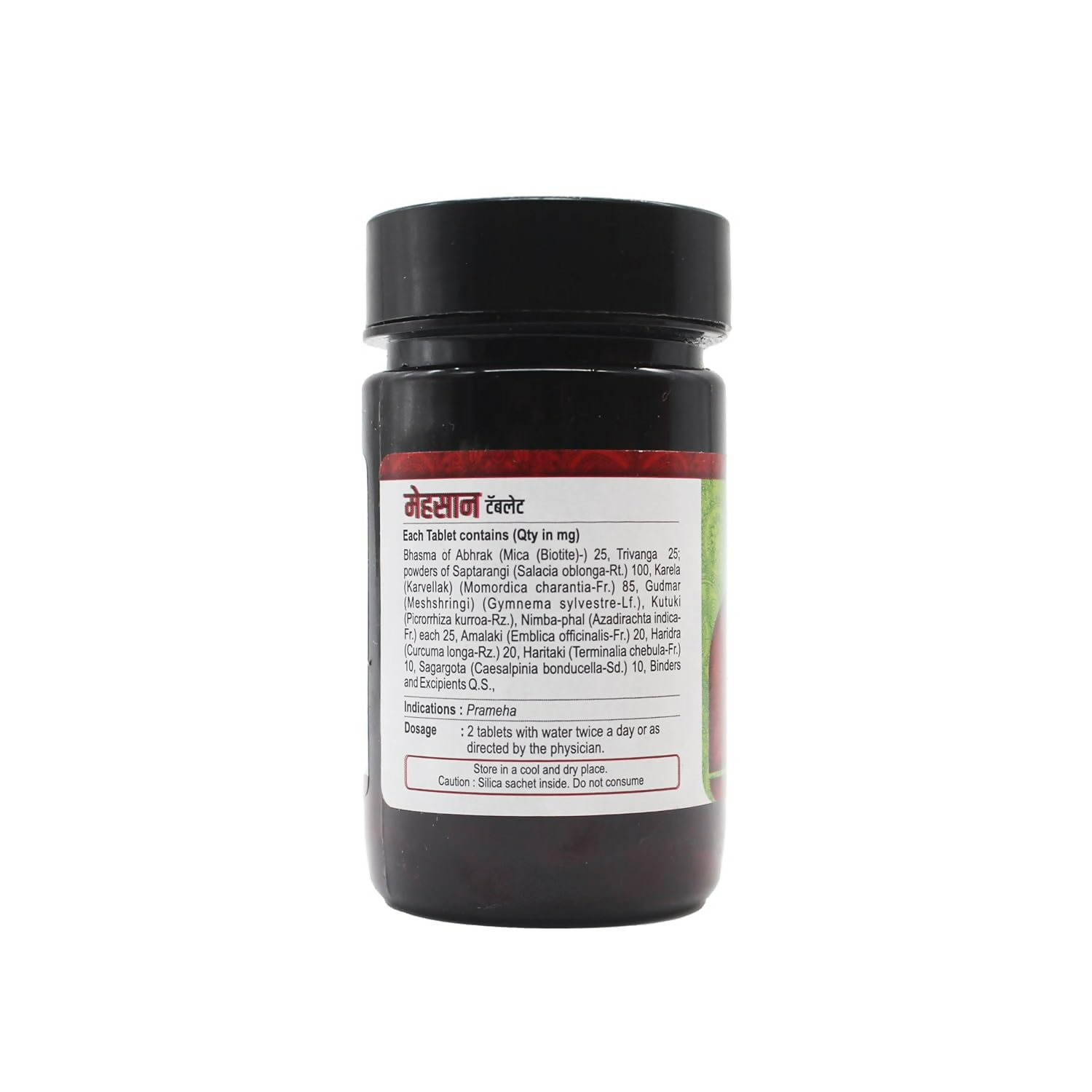 Ingredients:- Each Tablet contains (Qty in mg) Bhasma of Abhrak 25, Trivanga 5 powders of Saptarangi (Salacia oblonga-Rt.) 100, Karela (Karvellak) (Momordica charantia-Fr.) 85, Gudmar (Meshshringi) (Gymnema sylvestre-Lf.), Kutuki (Picrohiza kurroa-Rz.), Nimba-phal (Azadirachta indica- each 25, Amalaki (Emblica officinalis-Fr.) 20, Haridra Fr. (Curcuma longa-Rz.) 20, Haritaki (Terminalia chebula-Ft) 10, Sagargota (Caesalpinia bonducella-Sd.) 10, Binders and Excipients Q.S.