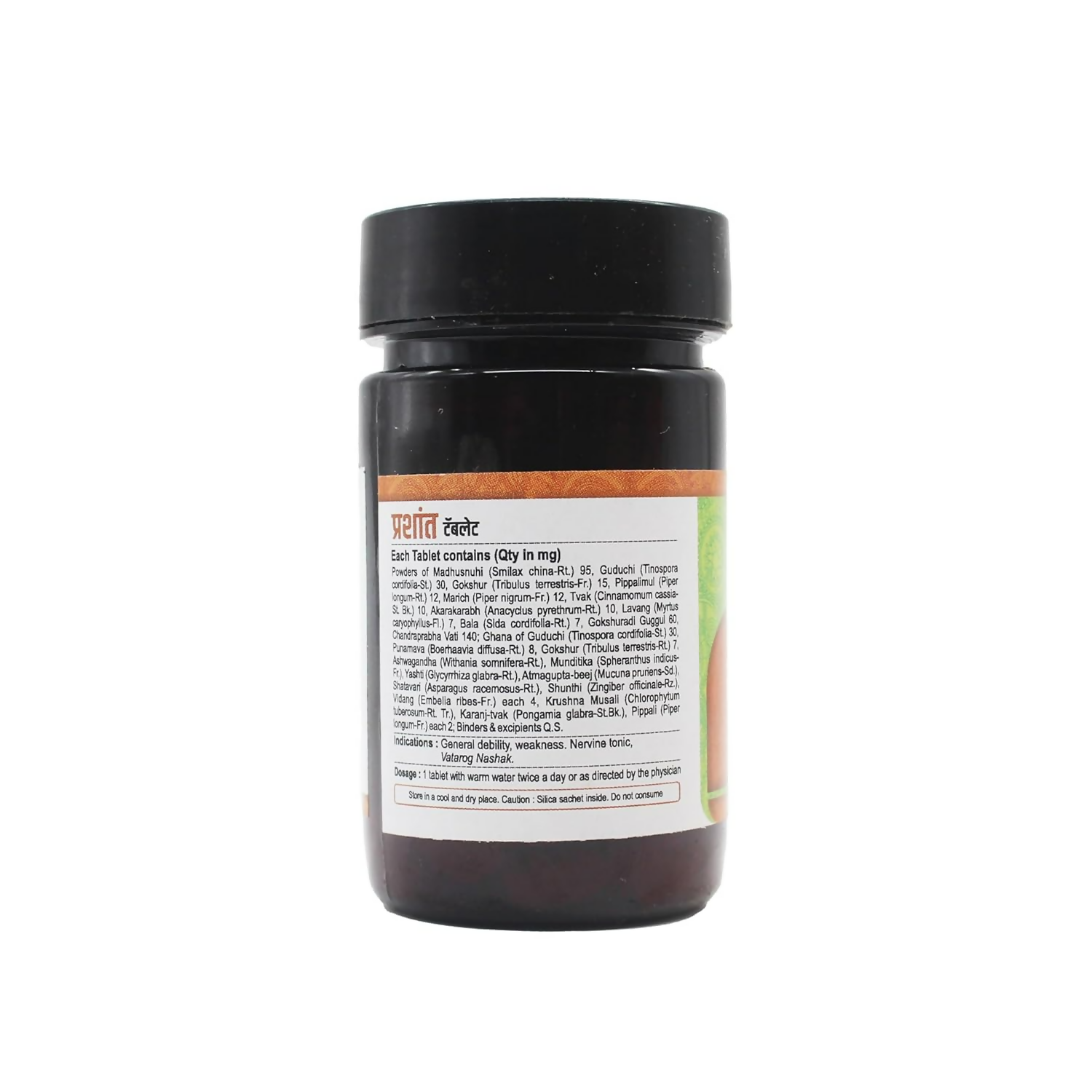Ingredients:- Each Tablet contains (Qty in mg) Powders of Madhusnuhi (Smilax china-Rt,) 95, Guduchi (Tinospora cordifolia-St.) 30, Gokshur (Tribulus terrestris-Fr.) 15, Pippalimul (Piper longum-Rt,) 12, Marich (Piper nigrum-Fr,) 12, Tvak (Cinamomum cassia-St.Bk.) 10, Akarakarabh (Anacyclus pyrethrum-Rt.) 10, Lavang (Myrtus caryophyllus-Fl,) 7, Bala (Sida cordifolia-St.) 7, Gokshuradi Guggulu Chandraprabha Vat 140; Ghana of Guduchi (Tinospora cordifolia-St) 30, Punarnava (Boerhaavia diffusa-Rt.) 8, Gokshur (Tribulus terastis-Ri)7, Ashwagandha [Withania somnifera-Rt), Munditika (Spheranthus indicus Yashti (Glycymhiza glabra-Rt.), Atmagupta-beej (Mucuna pruriens-Sd, Shatavari (Asparagus racemosus-Rt.), Shunthi (Zingiber oficinale Rz.) Vidang (Embelia ribes-Fr.) each 4, Krushna Musalli (Chlorophyum tiberosum-Rt. Tr.)., Karanj-tvak (Pongamia glabra-St.Bk.), Pipali (Piper Iongum-Fr.) each 2: Binders excipients Q.S.