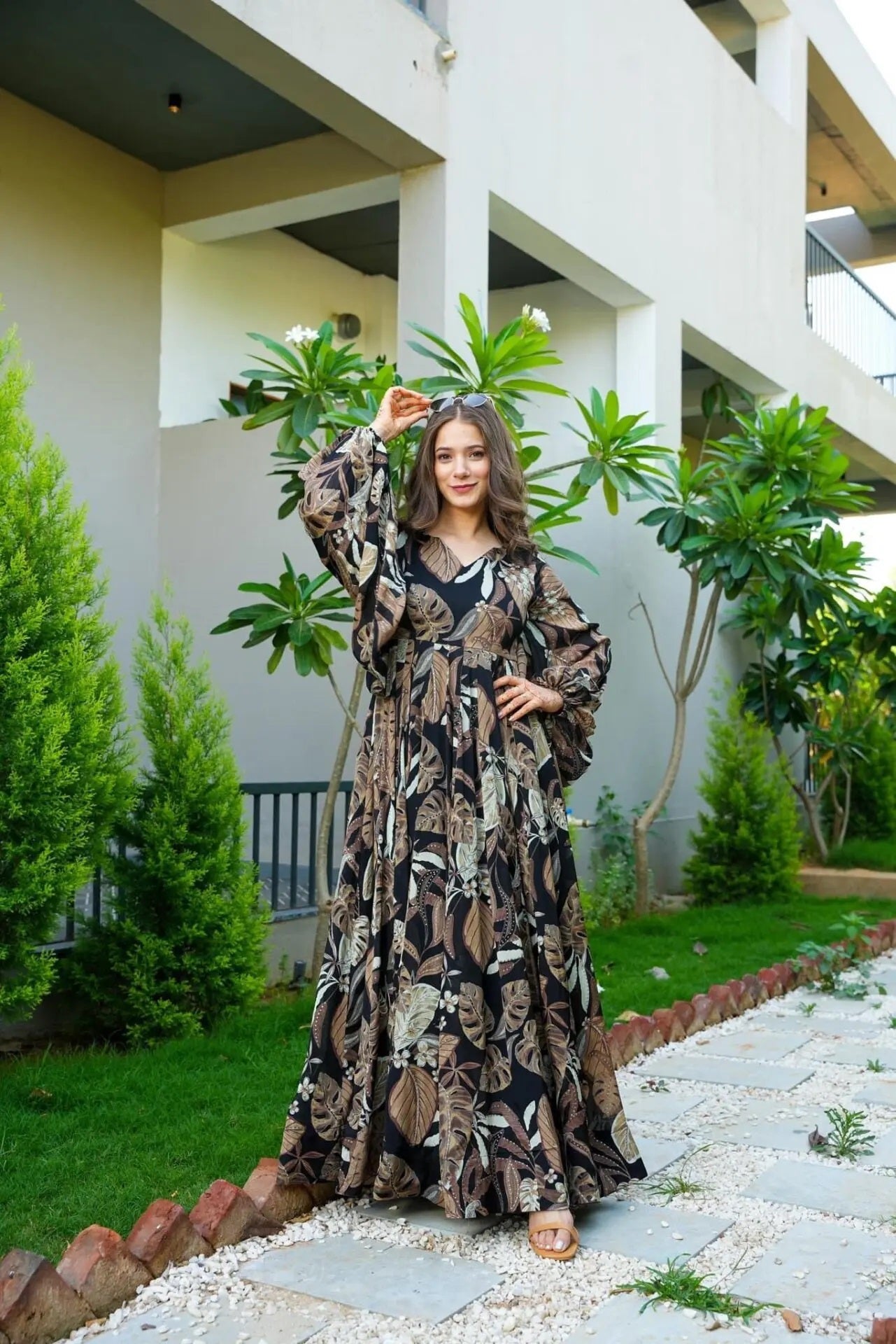 Sonakshi Women's Black Air tex Chinon Digital Print Full Round Flair Anarkali Gown Set