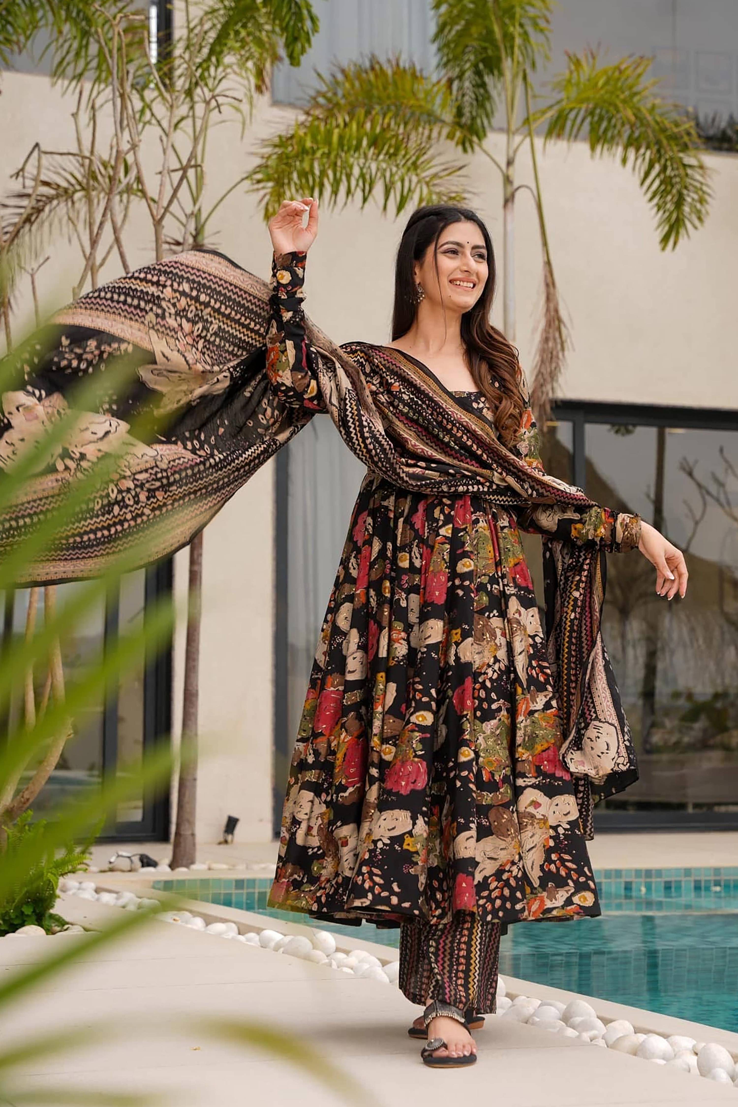 Sonakshi Women's Black Mal cottan Digital Print Full Round Flair Anarkali Gown Set With Dupatta