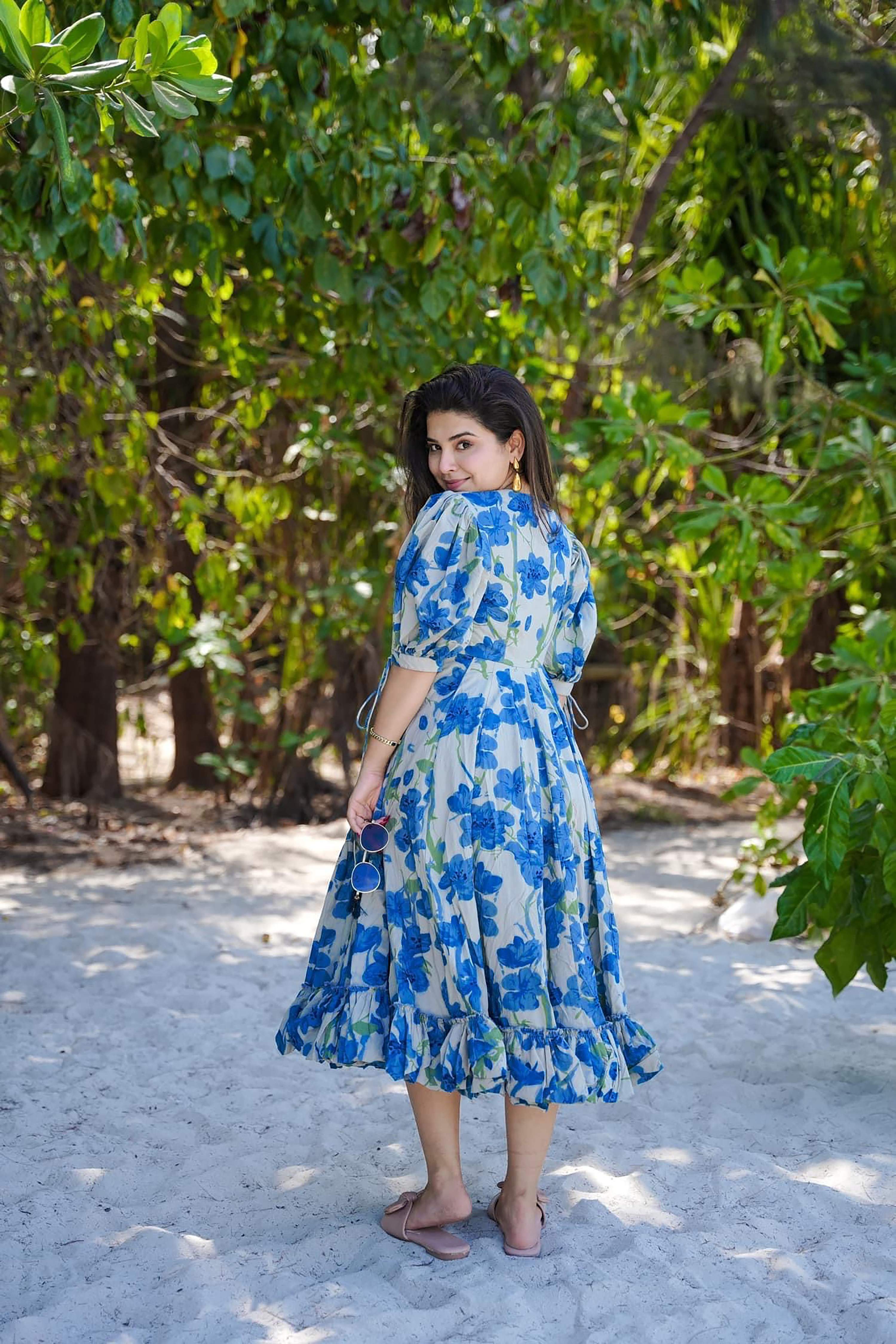 Sonakshi Women's Blue Rayon Digital Print Full Round Flair Anarkali Gown Set