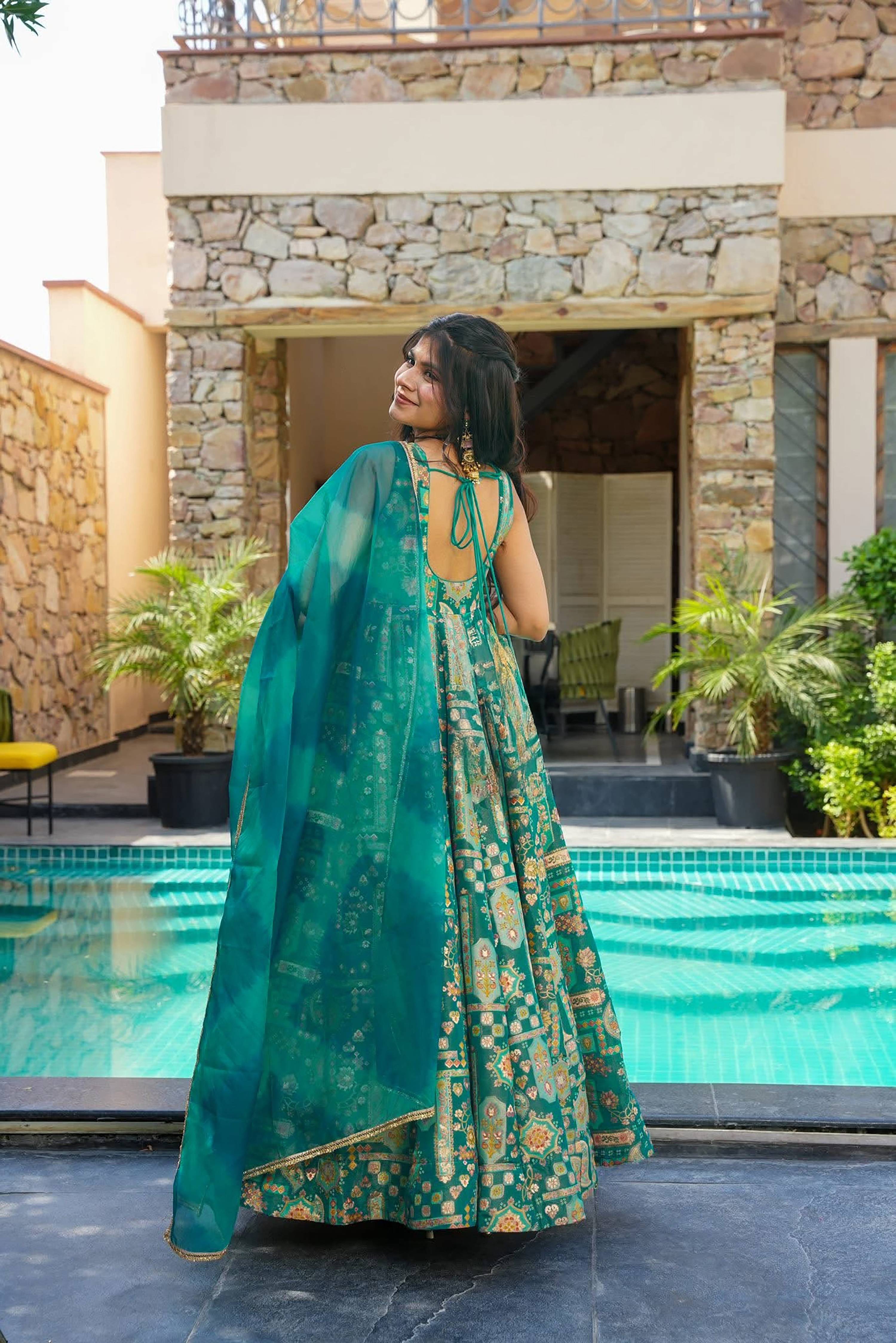 Sonakshi Women's Green Silk Digital Print Full Round Flair Anarkali Gown Set With Dupatta