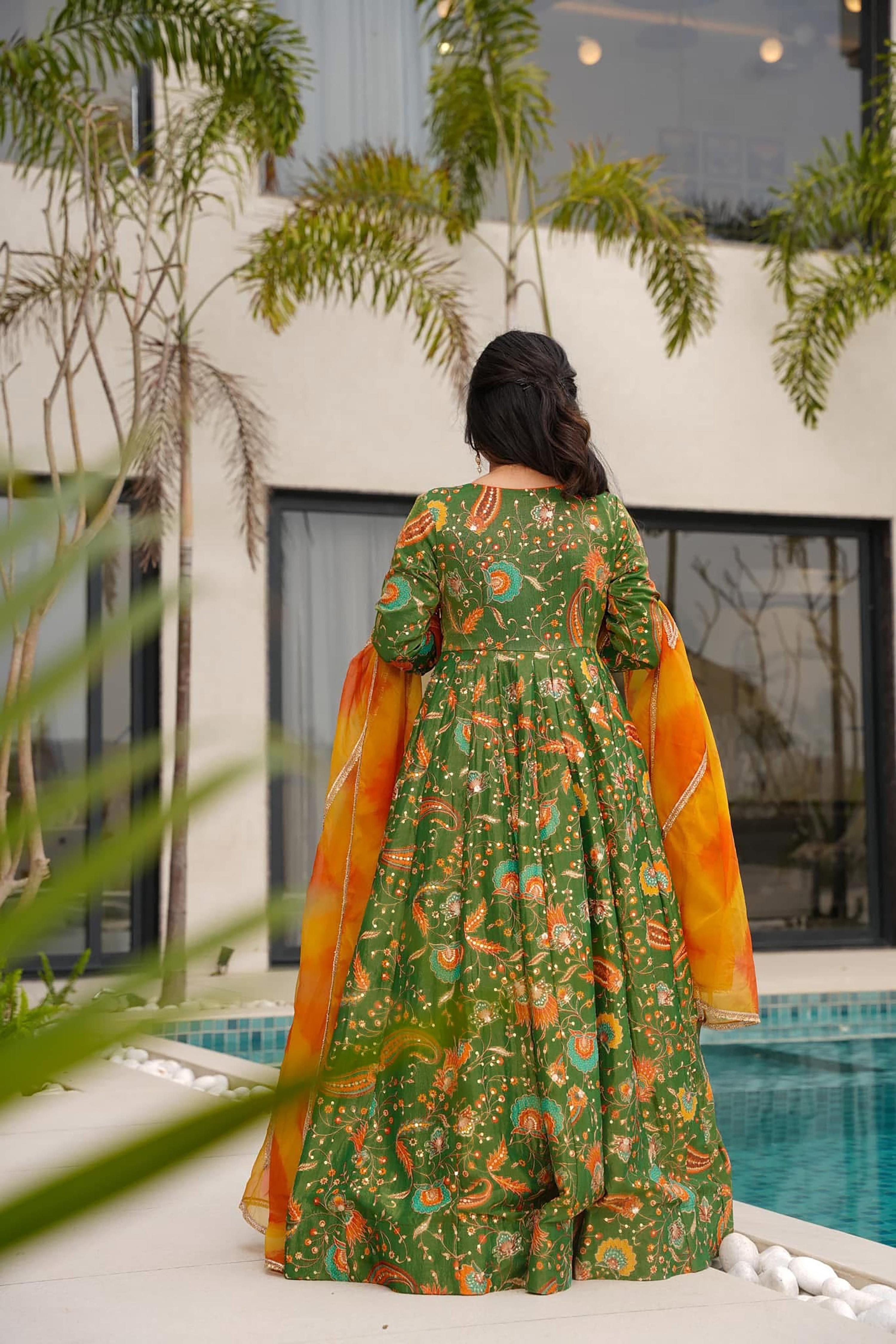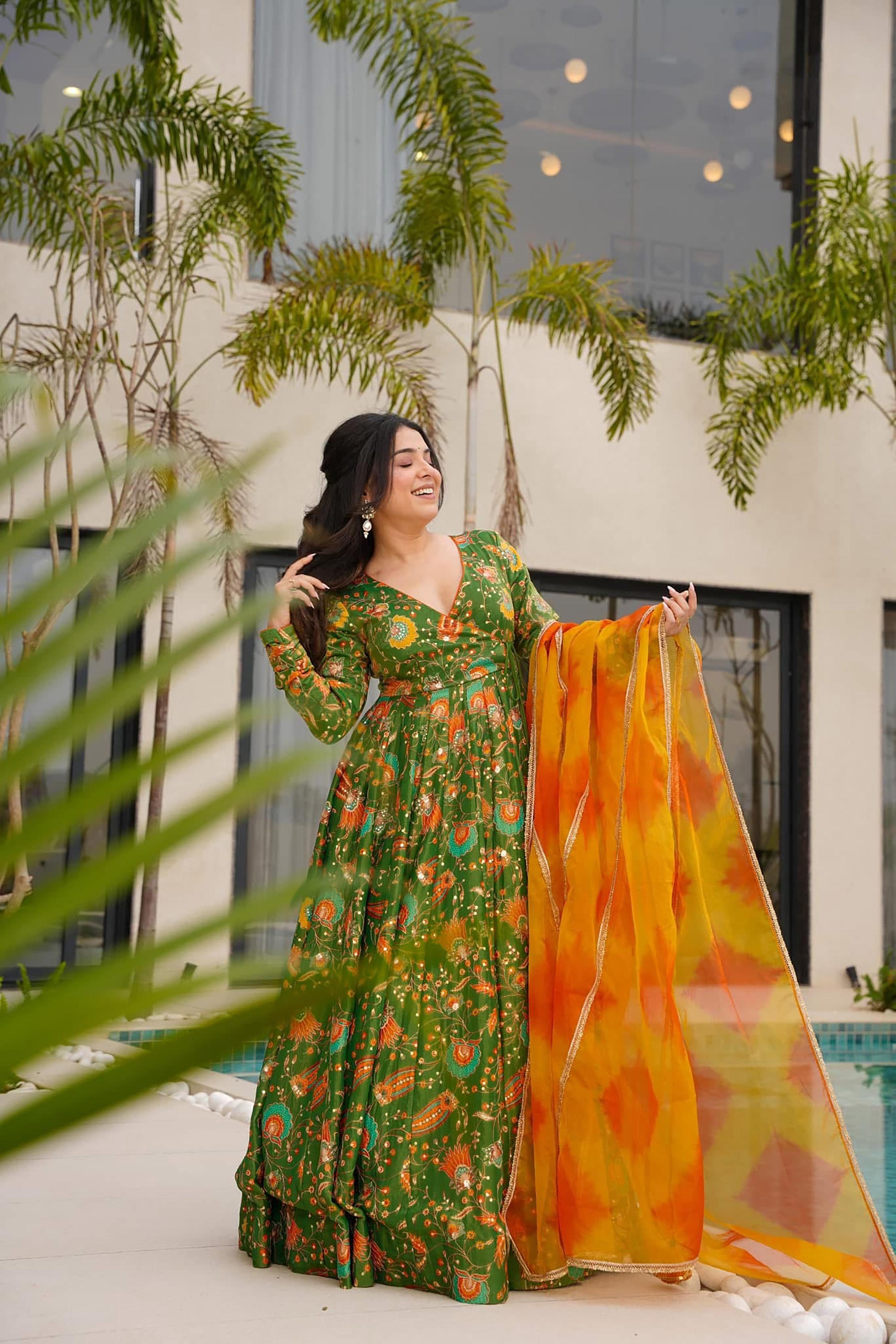 Sonakshi Women's Mehendi Silk Digital Print Full Round Flair Anarkali Gown Set With Dupatta