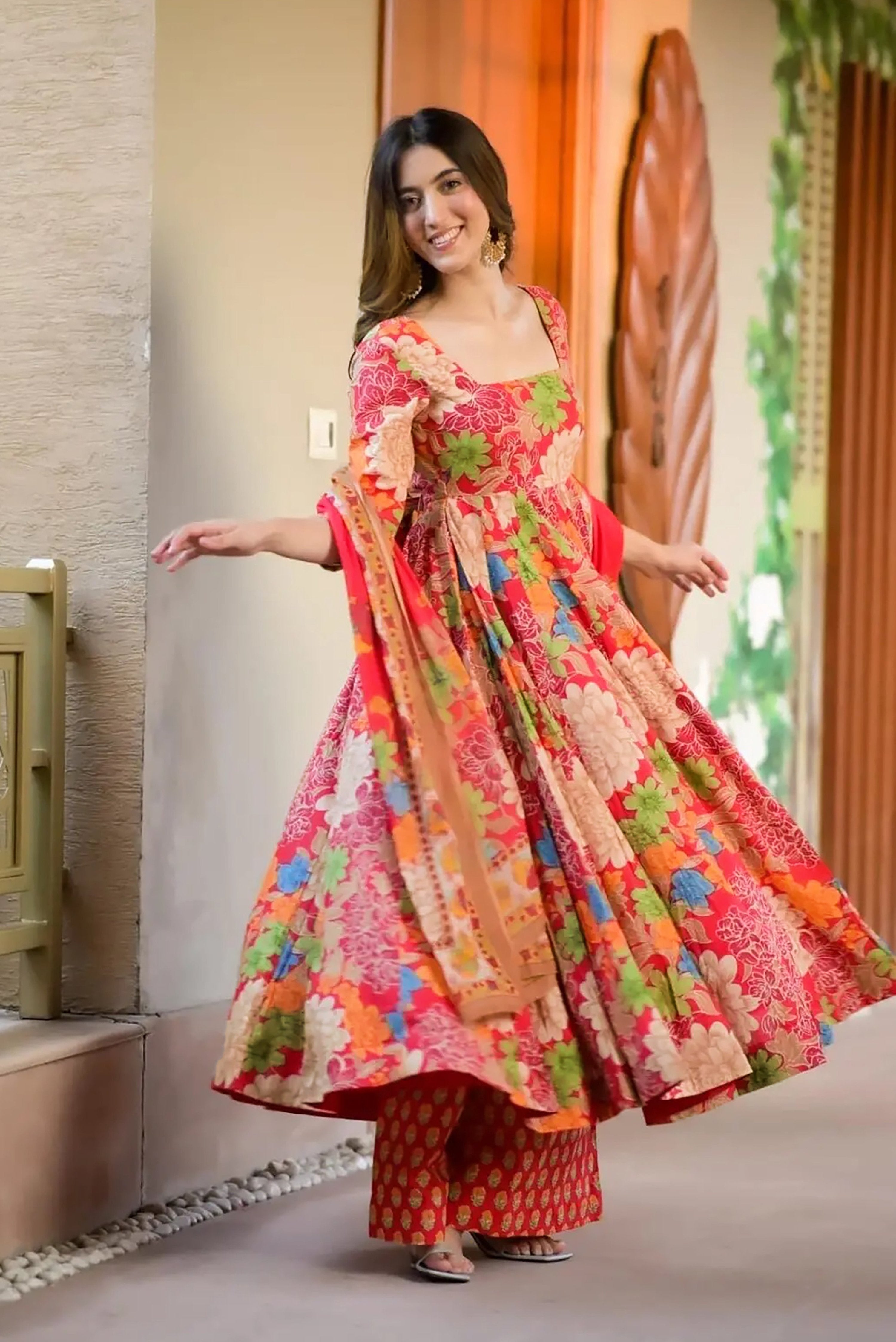 Sonakshi Women's Multycolor Maslin Digital Print Full Round Flair Anarkali Gown Set With Dupatta