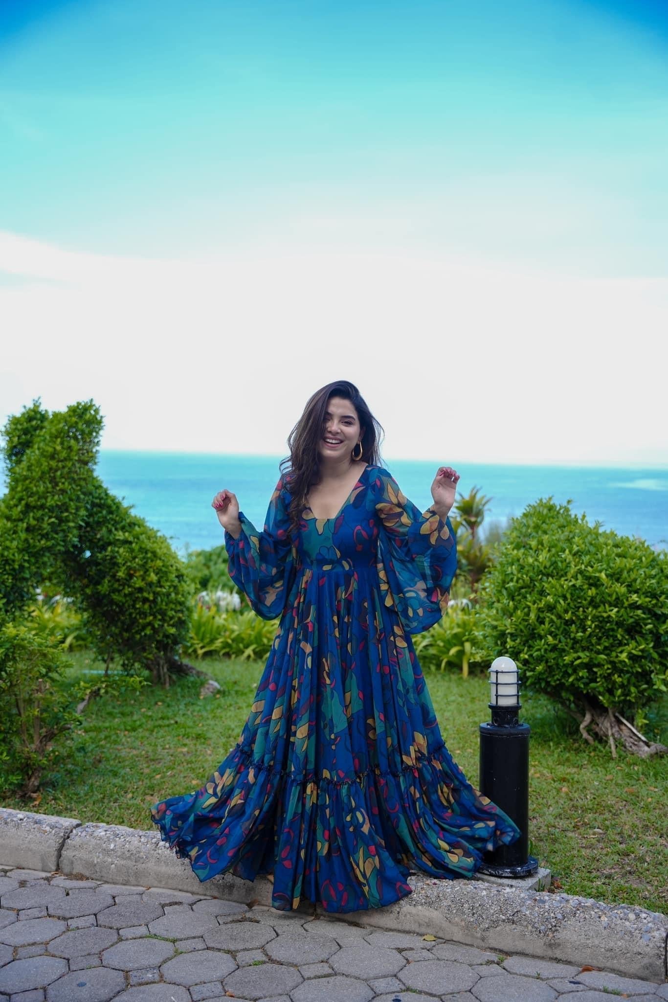 Sonakshi Women's Peacock Air tex Chinon Digital Print Full Round Flair Anarkali Gown Set