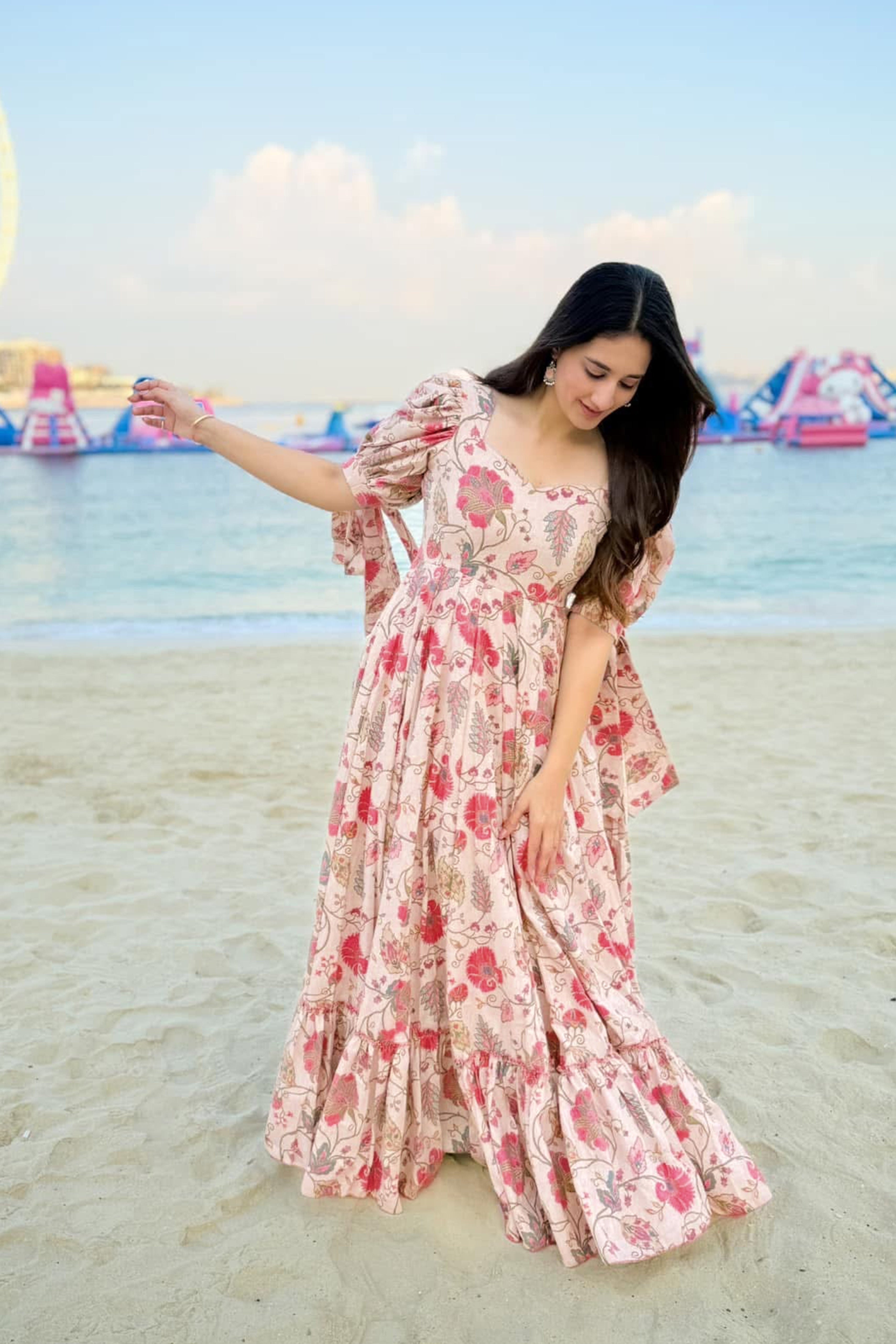 Sonakshi Women's Pink Rayon Digital Print Full Round Flair Anarkali Gown Set