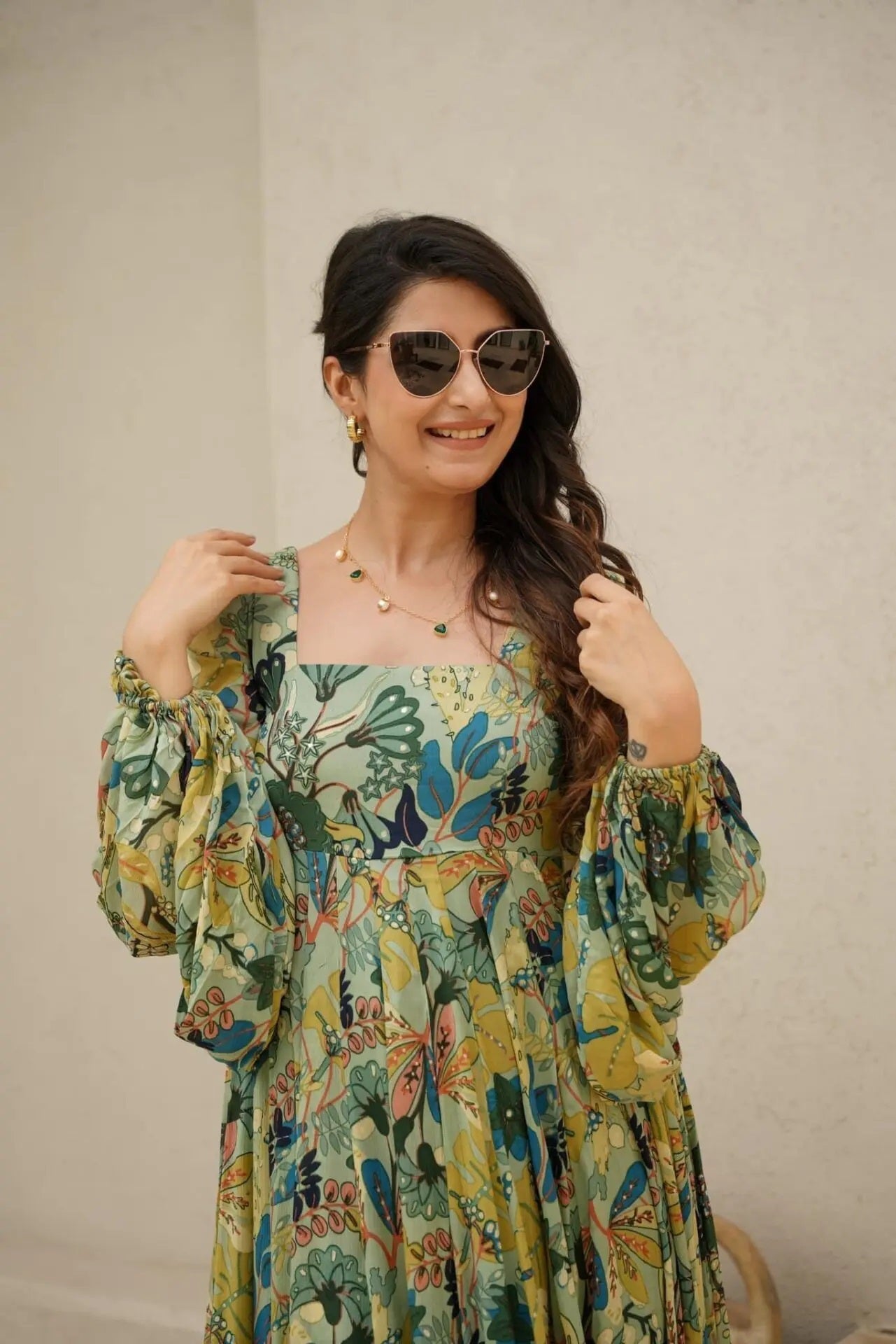 Sonakshi Women's Pista Air tex Chinon Digital Print Full Round Flair Anarkali Gown Set