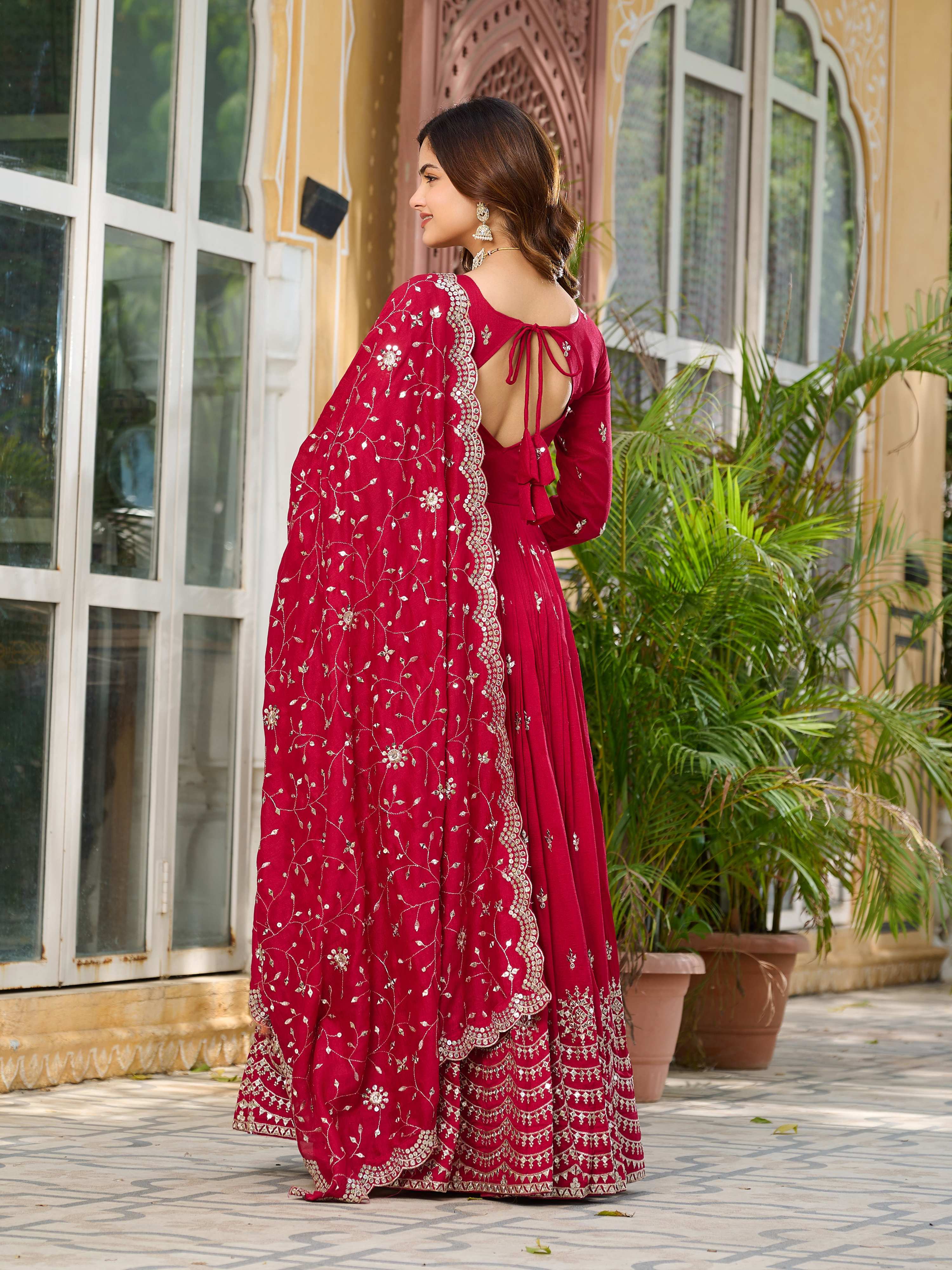 Sonakshi Women's Rani Vichitra Silk Sequence Embroidered Anarkali Gown Set With Dupatta
