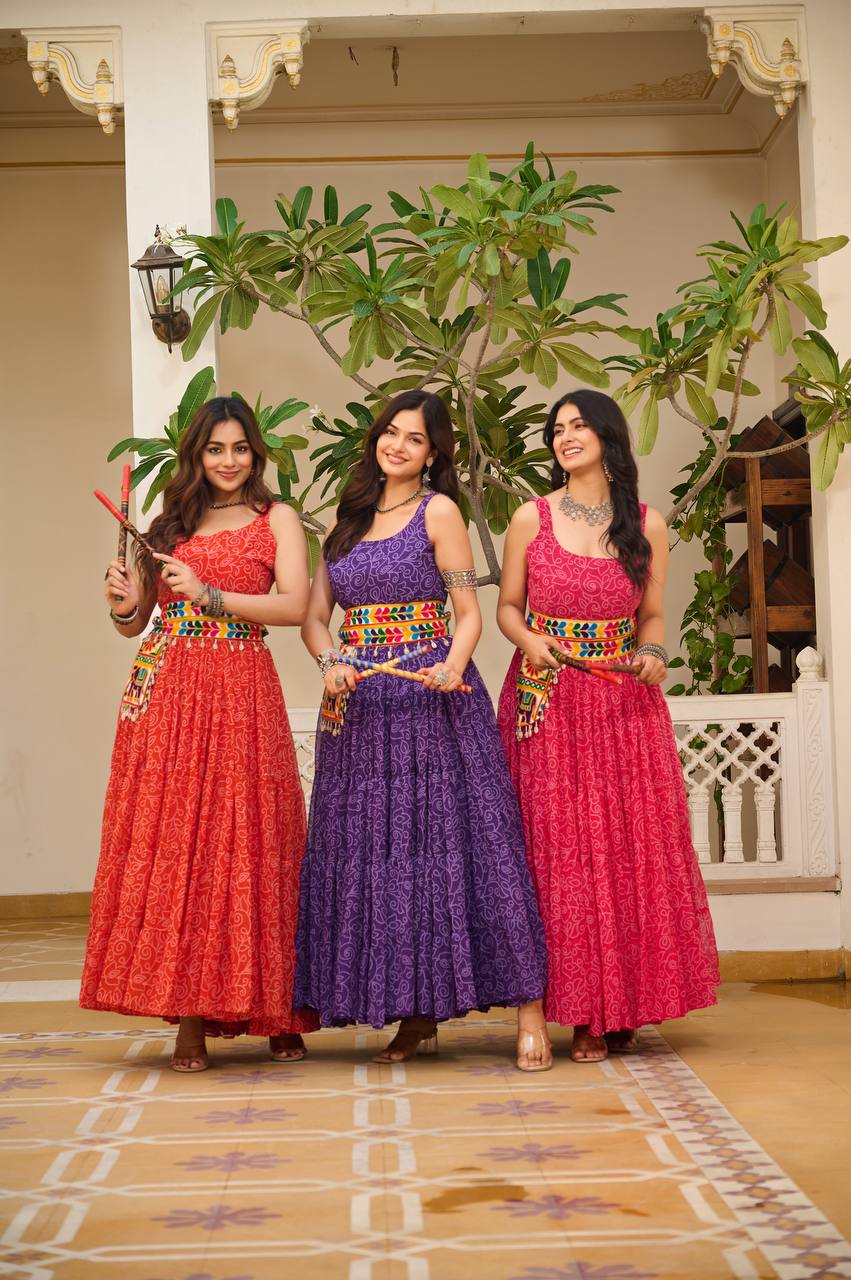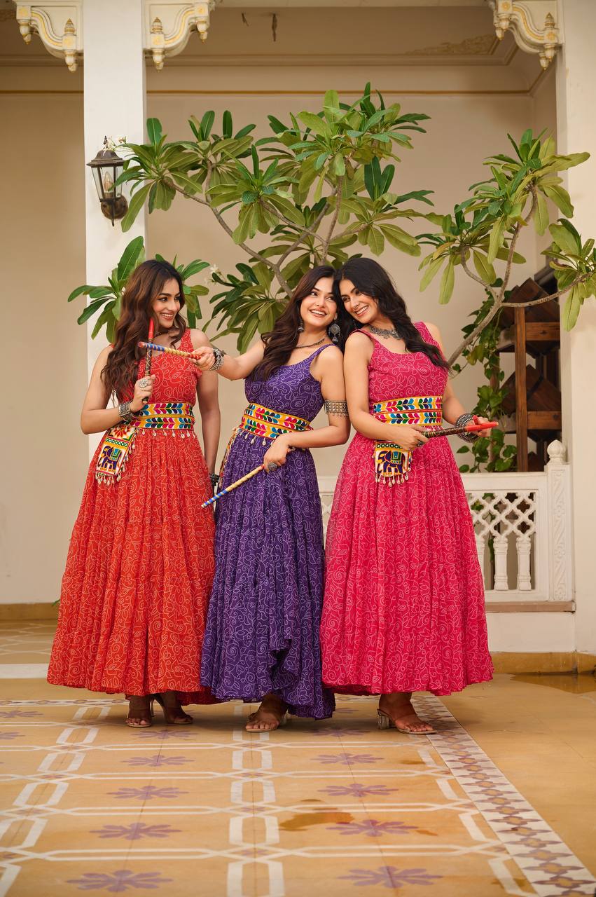 Sonakshi Women's Red Rani & Blue Georgette Bandhni Print Gamathi Work With Real Mirror Anarkali Gown Set