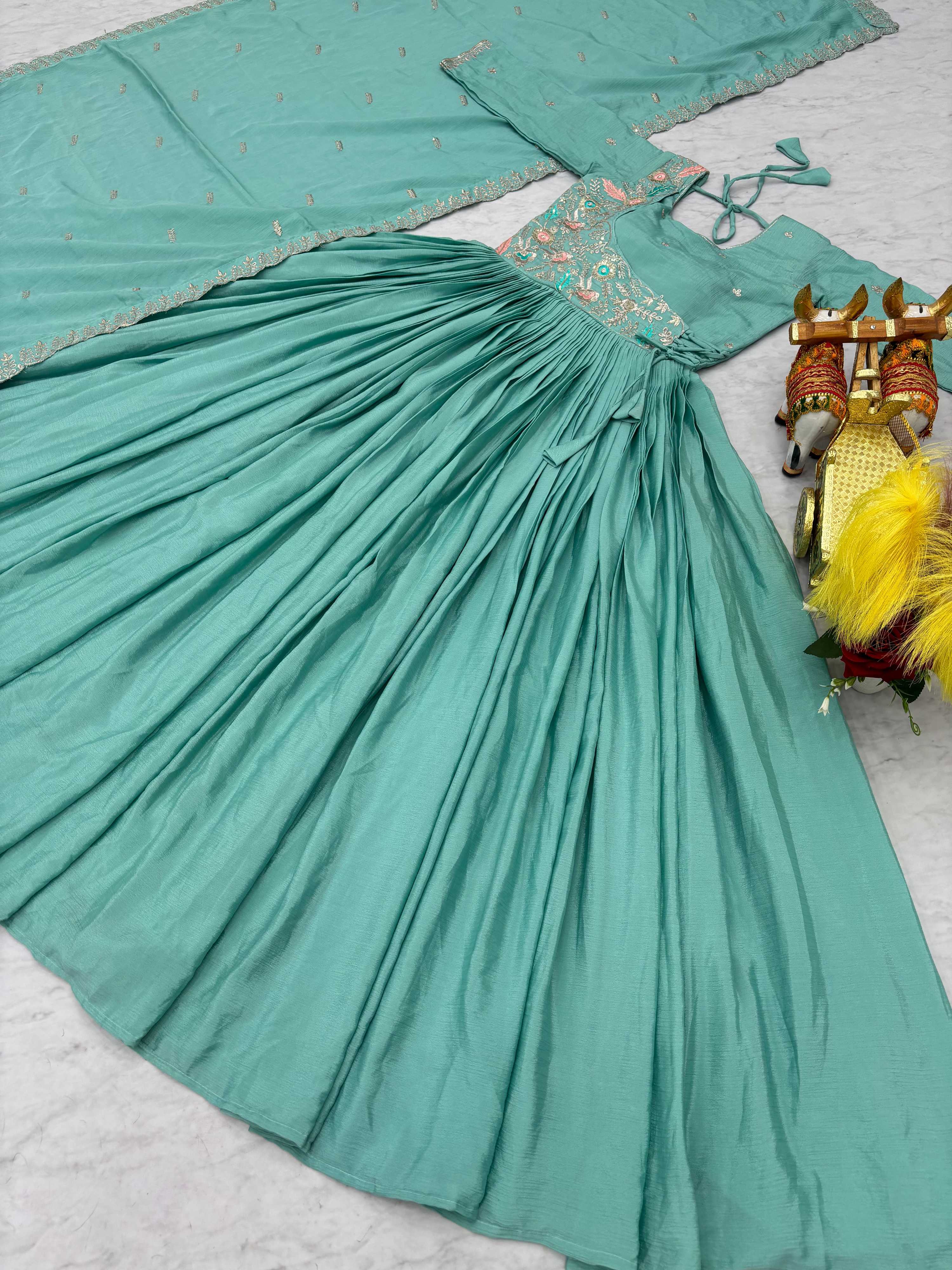 Sonakshi Women's Sky Chinon Thread Sequence Anarkali Gown Set With Dupatta