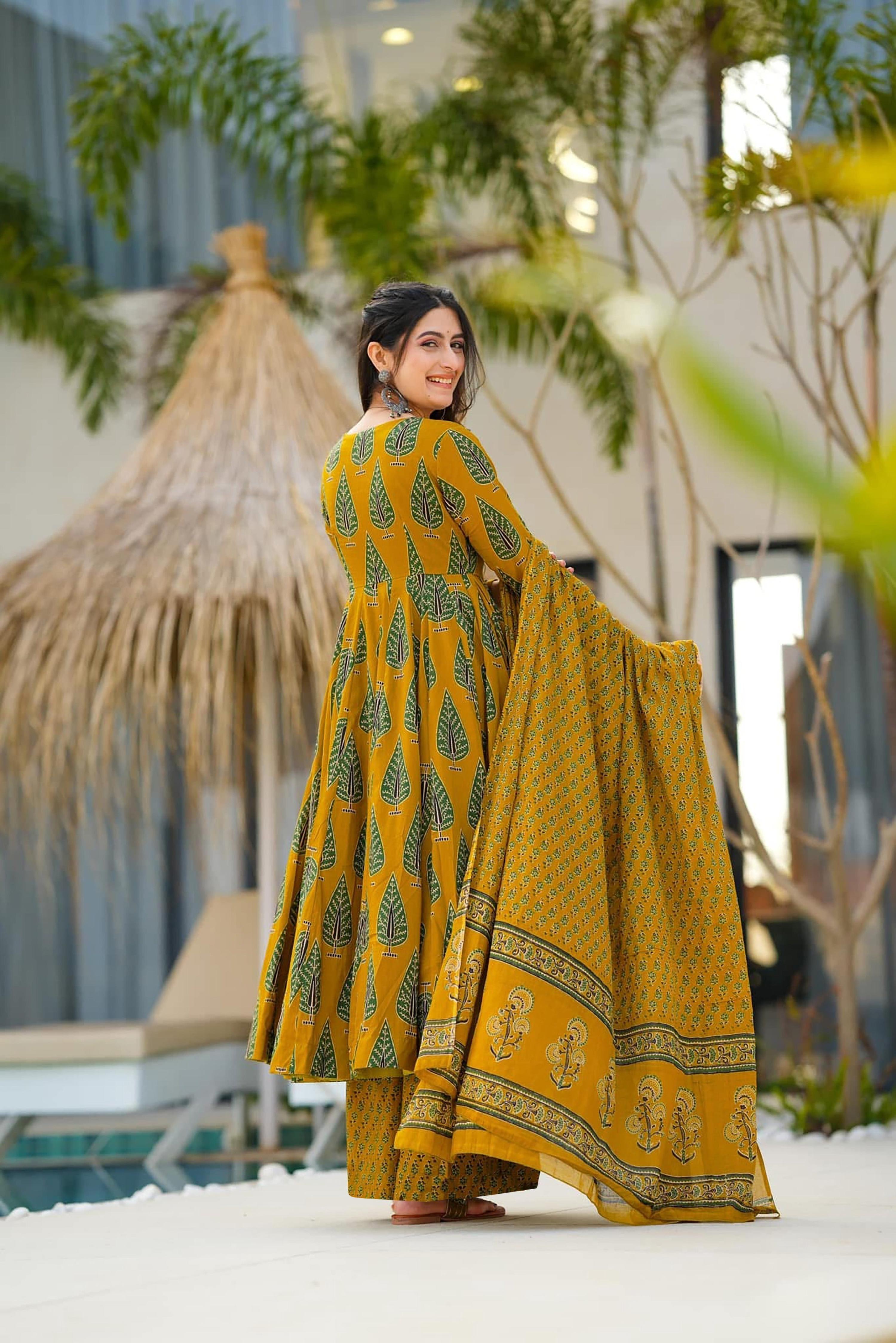 Sonakshi Women's Yellow Maslin Digital Print Full Round Flair Anarkali Gown Set With Dupatta