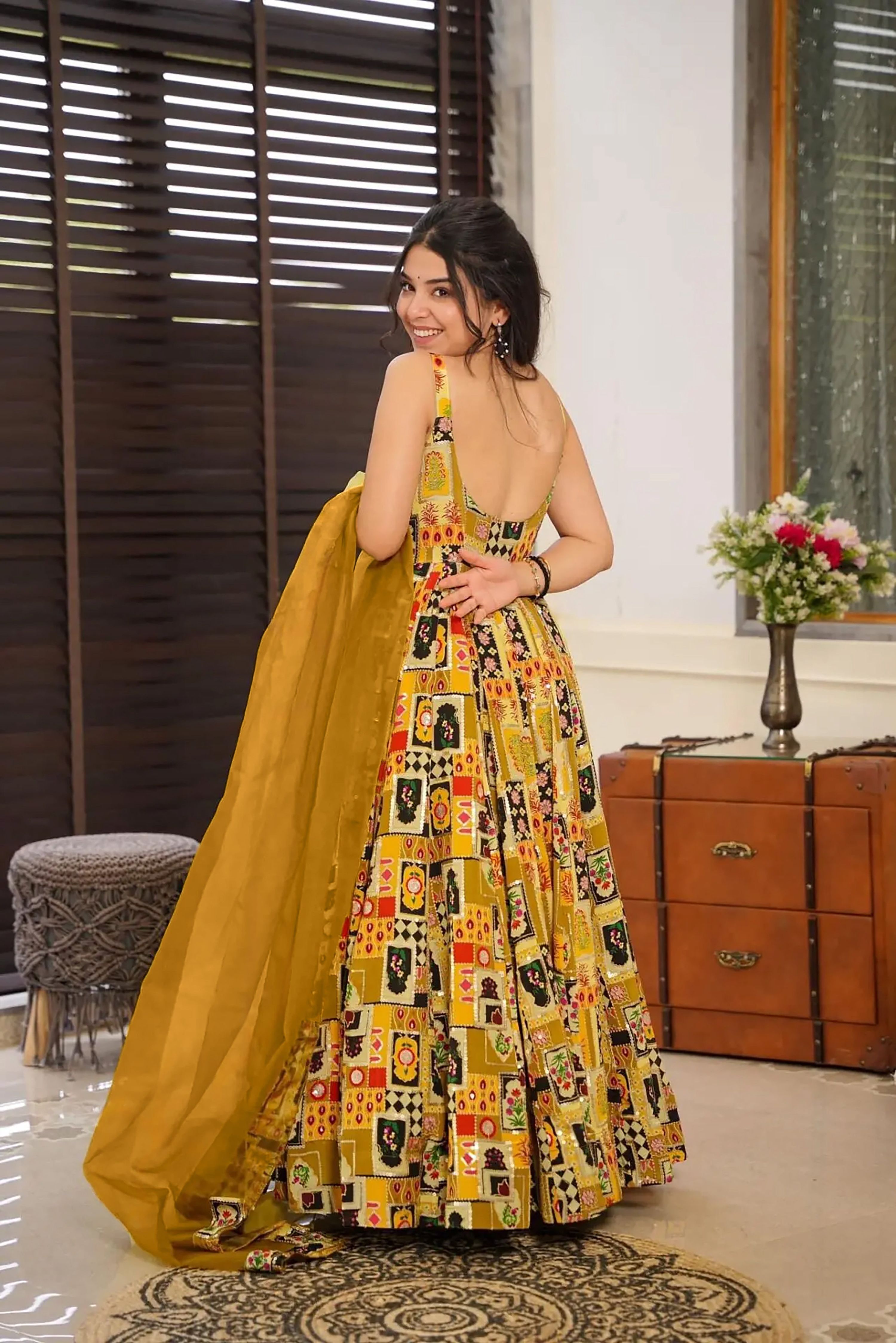 Sonakshi Women's Yellow Silk Digital Print Full Round Flair Anarkali Gown Set With Dupatta