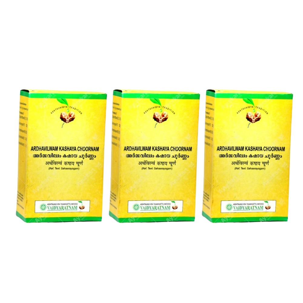 Vaidyaratnam Ardhavilwam Kashaya Choornam is an all-natural decoction. This herbal powder is made with