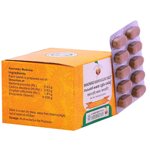 Vaidyaratnam Sahacharadi Kashaya Gulika is an Ayurvedic formulation. This herbal supplement is traditionally used for pain relief.