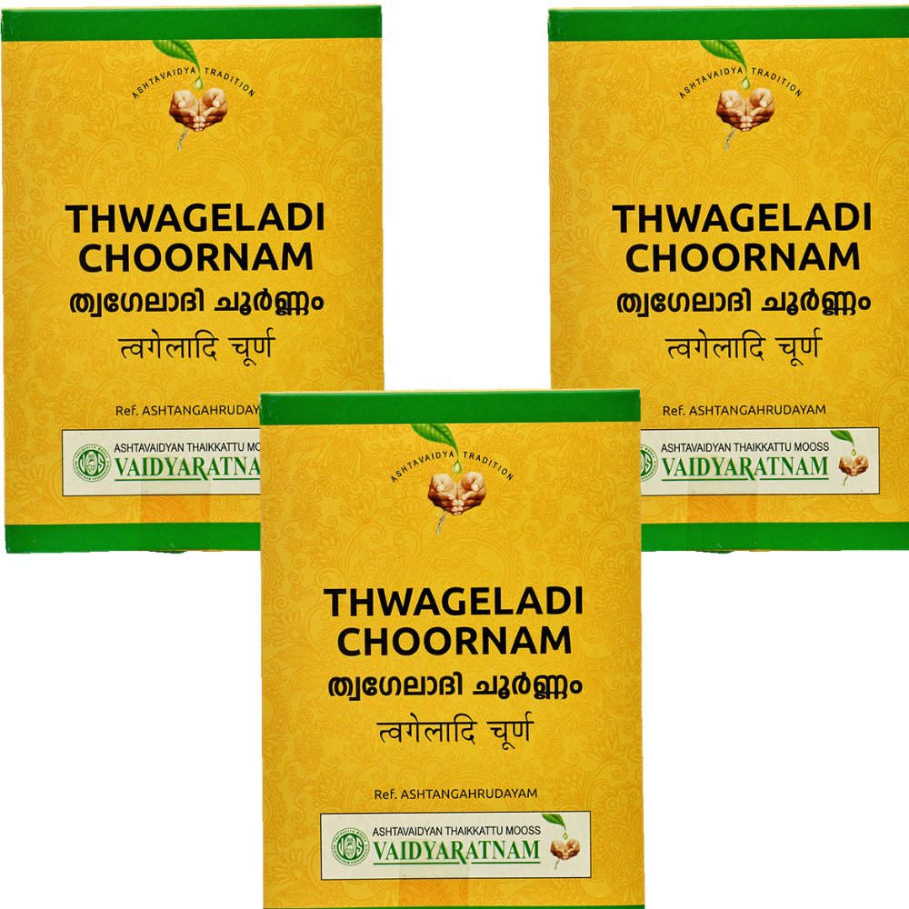 Vaidyaratnam Thwageladi Choornam is a traditional Ayurvedic powder made with plant-based ingredients. Commonly prepared following classical Ayurveda practices, this herbal blend is also known as Twageladi Choornam.